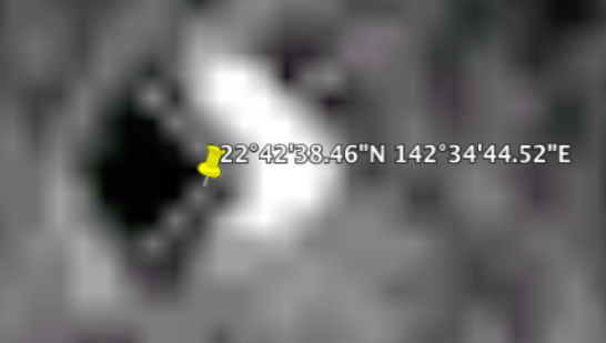 Select ‘Moon’ from the menu icon that looks like Saturn, and then enter the coordinates 22°42’38.46″N 142°34’44.52″E. (Click on the yellow pin and enter the coordinates for N latitude and E longitude.)